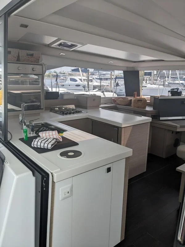 It was produced by Fountaine Pajot shipyard in 2023 and available for charter in Beach Resort Marina.
