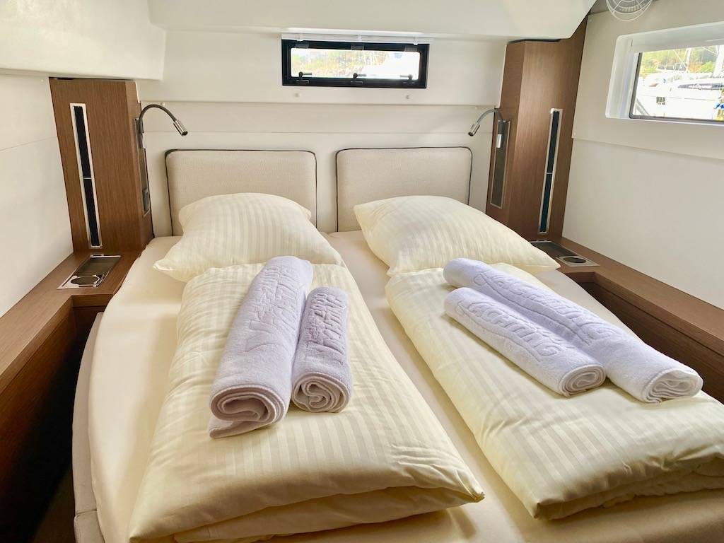 A 46–48 ft catamaran offers an exceptional balance of space and comfort. The wide design creates expansive outdoor areas perfect for lounging, dining, and enjoying the open sea. The interior features bright panoramic views, spacious cabins, and a modern saloon that becomes the social center of the yacht. Stable, comfortable, and easy to enjoy, this catamaran size is perfect for relaxed cruising with family or friends.